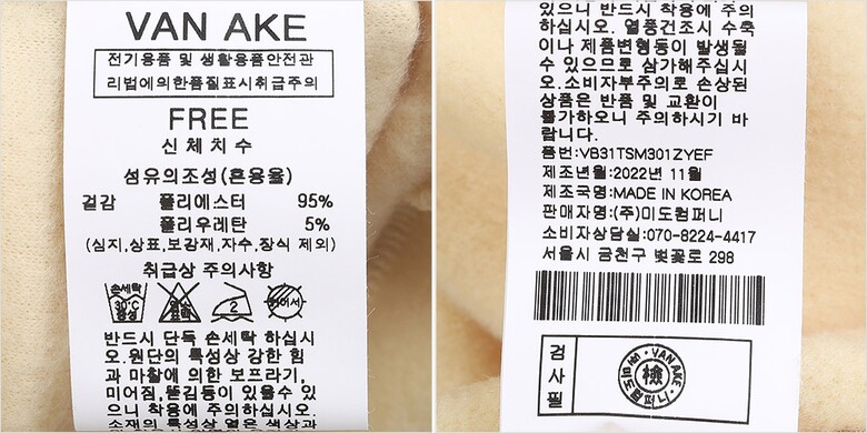 1. 제품 소재 (섬유의 조성 또는 혼용률을 백분율로 표시, 기능성인 경우 성적서 또는 허가서) | 겉감-폴리에스터95% 폴리우레탄5% |