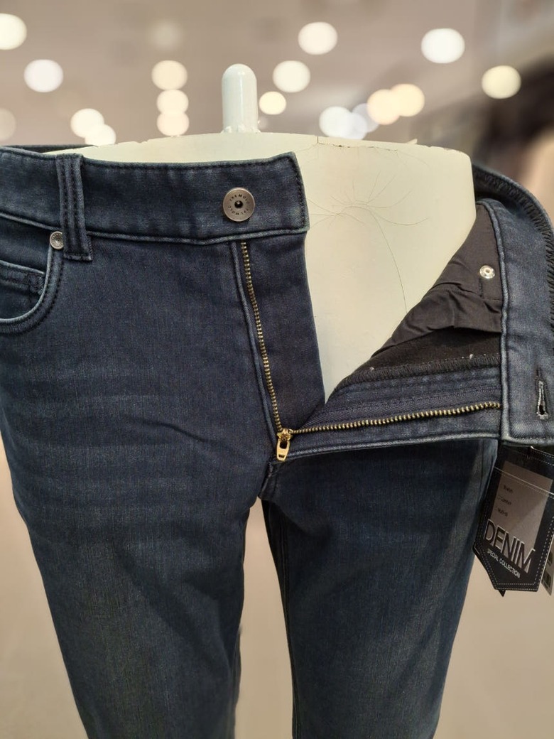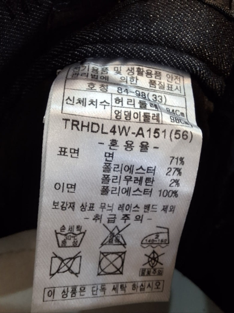 | 1. 제품 소재 (섬유의 조성 또는 혼용률을 백분율로 표시, 기능성인 경우 성적서 또는 허가서) | 데님, 면 71%, 폴리에스테르 27%, 폴리우레탄 2% |