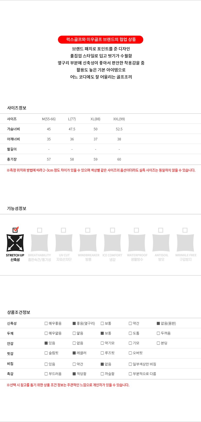 | 1. 제품 소재 (섬유의 조성 또는 혼용률을 백분율로 표시, 기능성인 경우 성적서 또는 허가서) | 상세설명참고 |