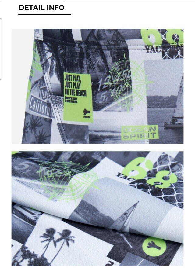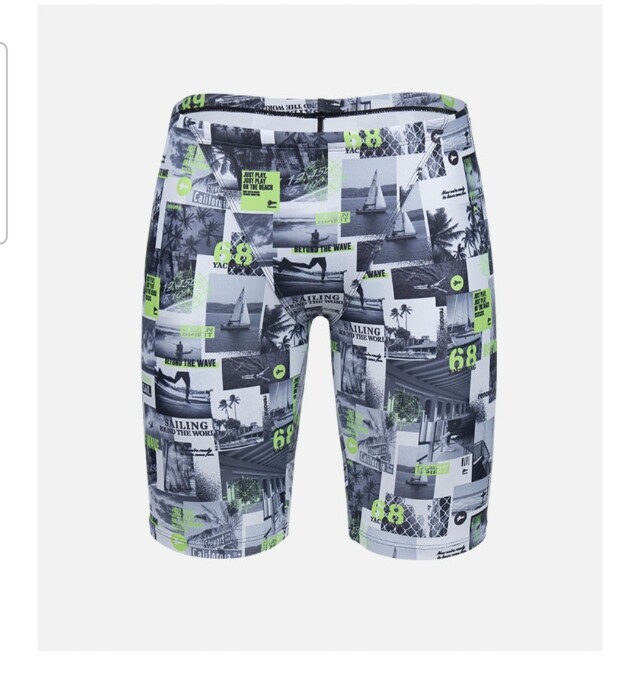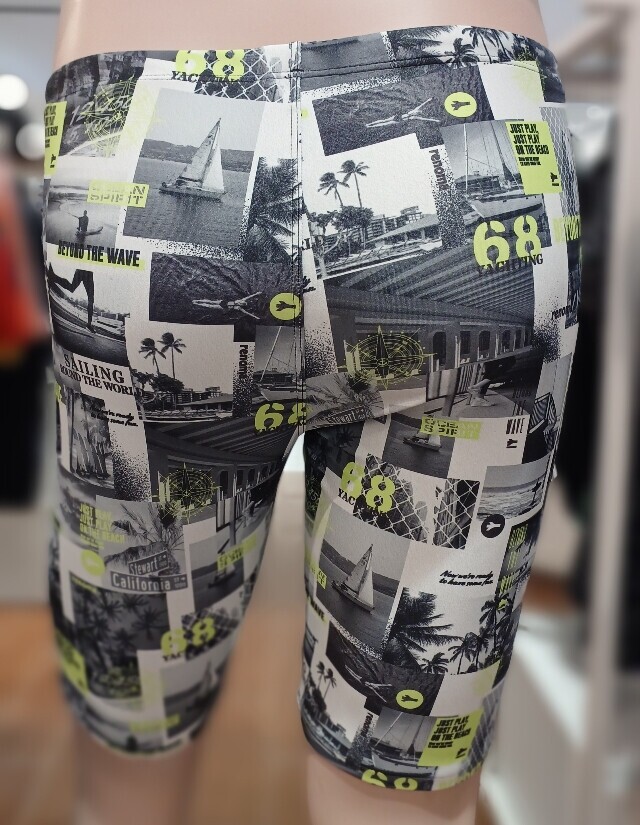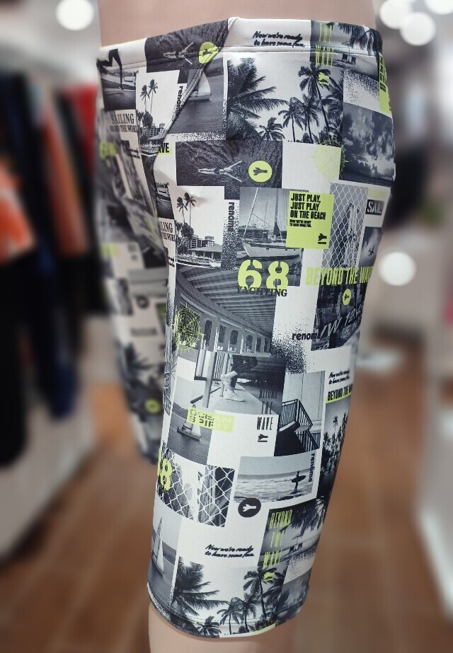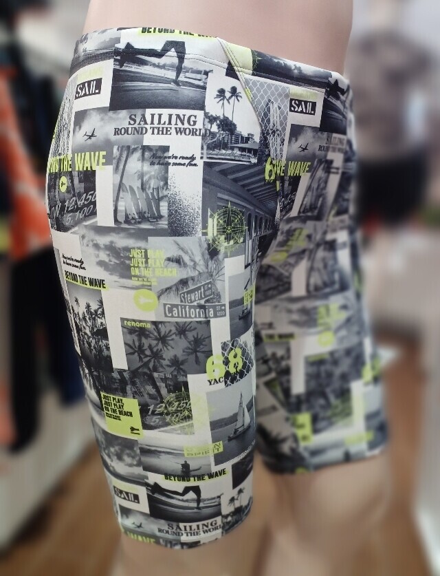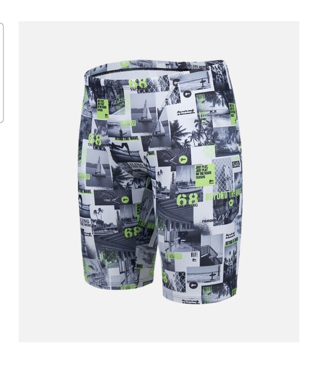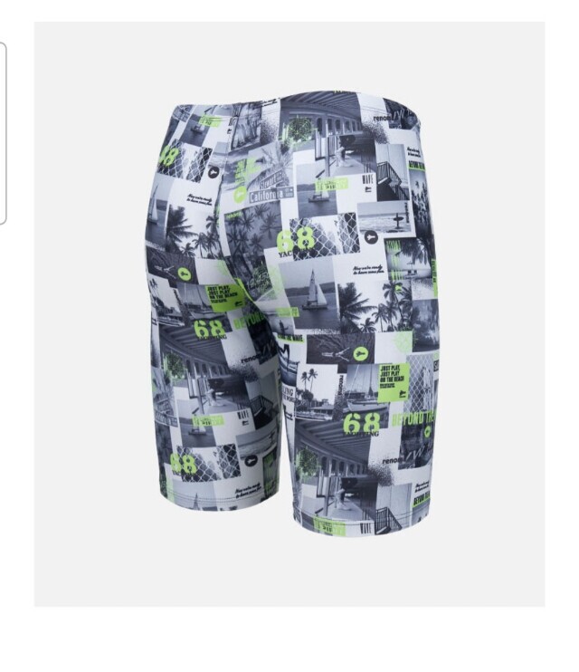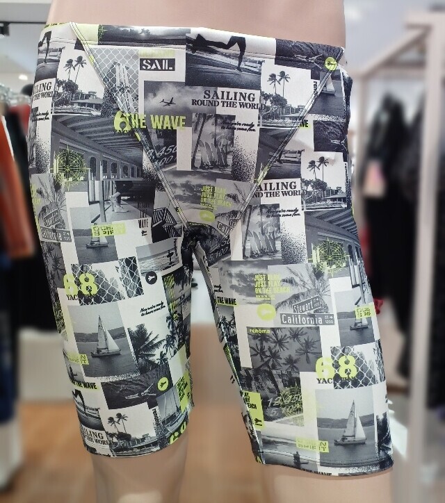 무채색 스냅 패턴에 형광 연두 컬러가 포인트로 라인 부담스럽지 않게 착용하기 편한 남성 4부 수영복입니다.