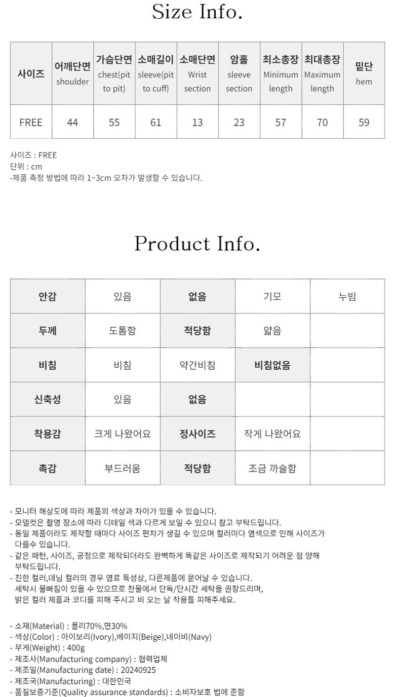 | 1. 제품 소재 (섬유의 조성 또는 혼용률을 백분율로 표시, 기능성인 경우 성적서 또는 허가서) | 상세이미지 참조 |