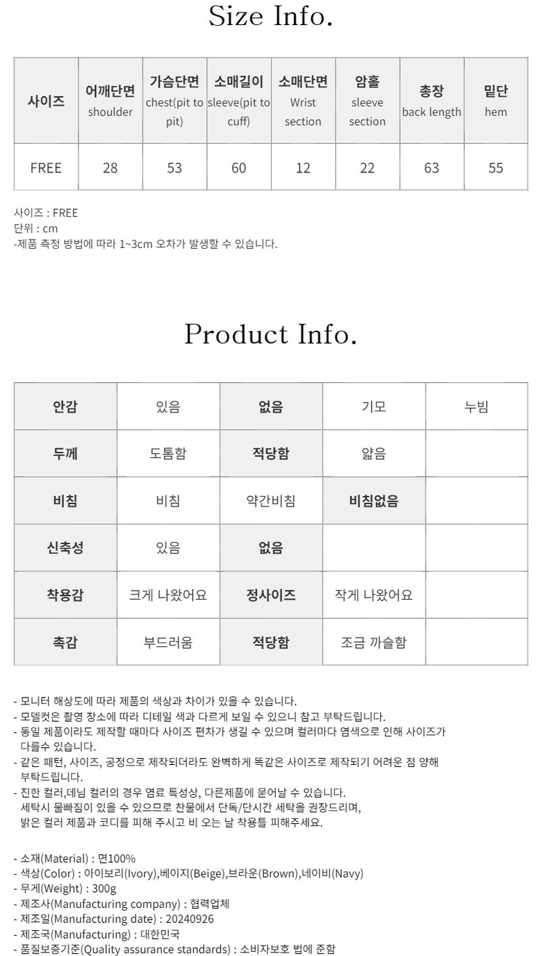 | 1. 제품 소재 (섬유의 조성 또는 혼용률을 백분율로 표시, 기능성인 경우 성적서 또는 허가서) | 상세이미지 참조 |