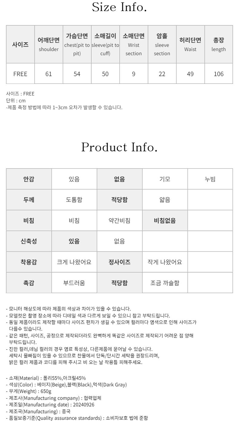 1. 제품 소재 (섬유의 조성 또는 혼용률을 백분율로 표시, 기능성인 경우 성적서 또는 허가서) | 상세이미지 참조 |