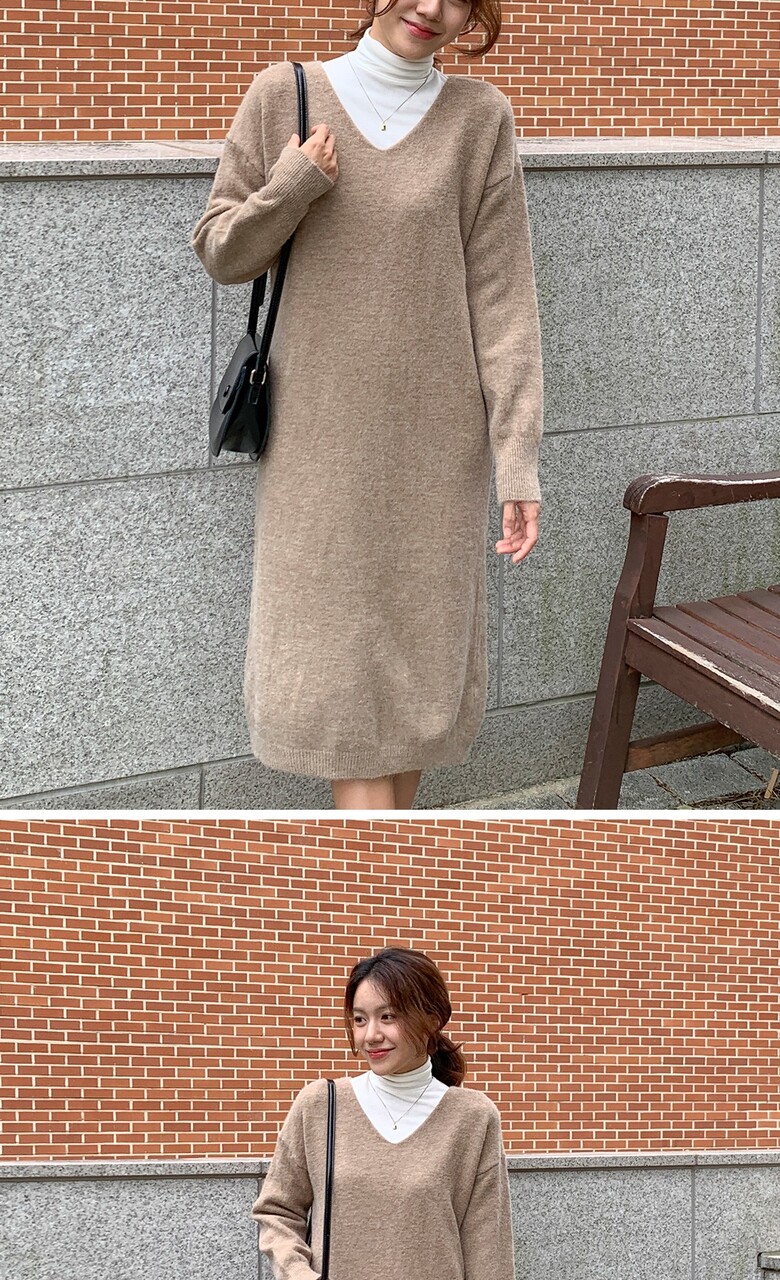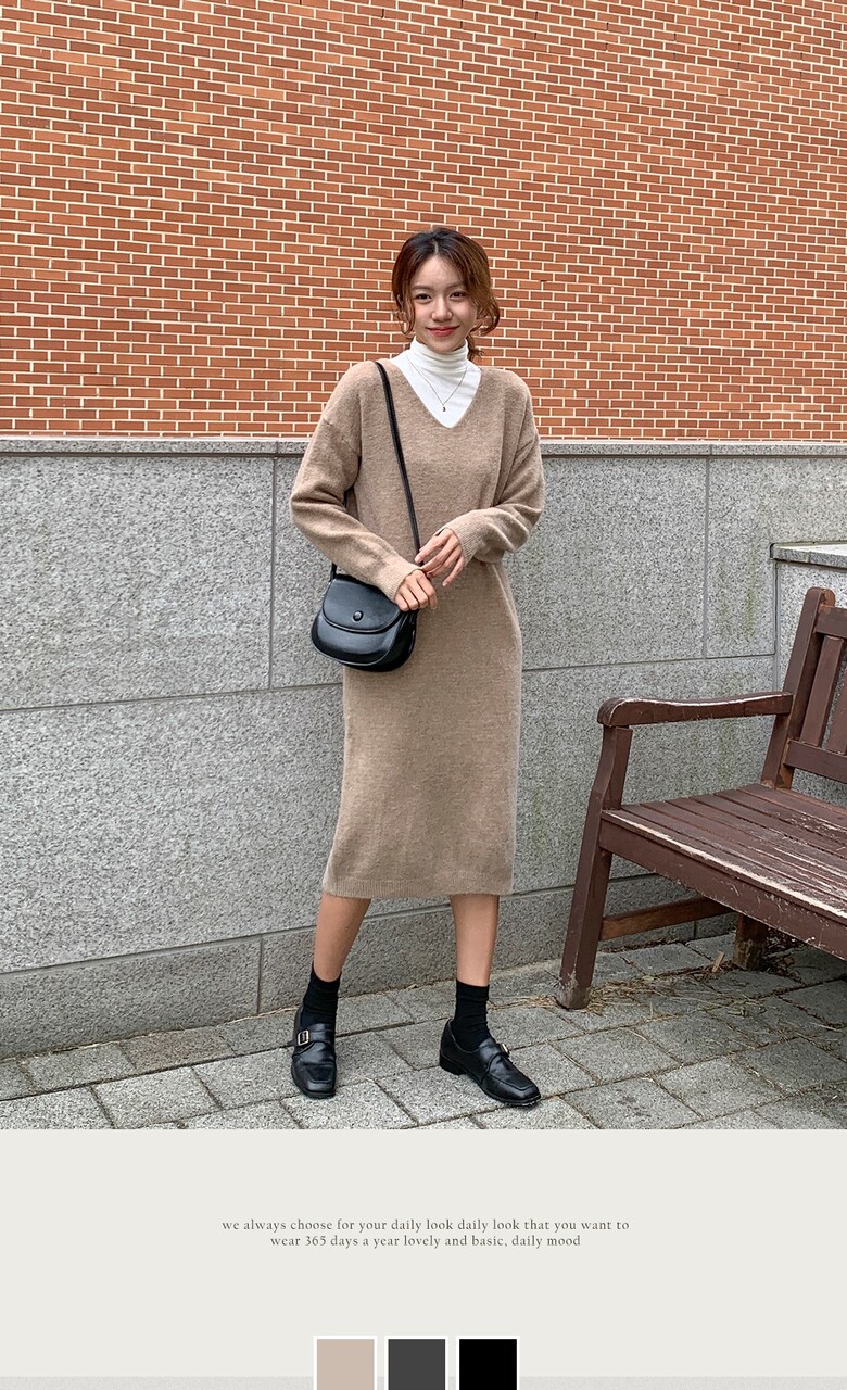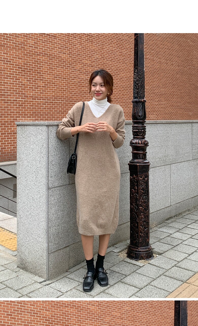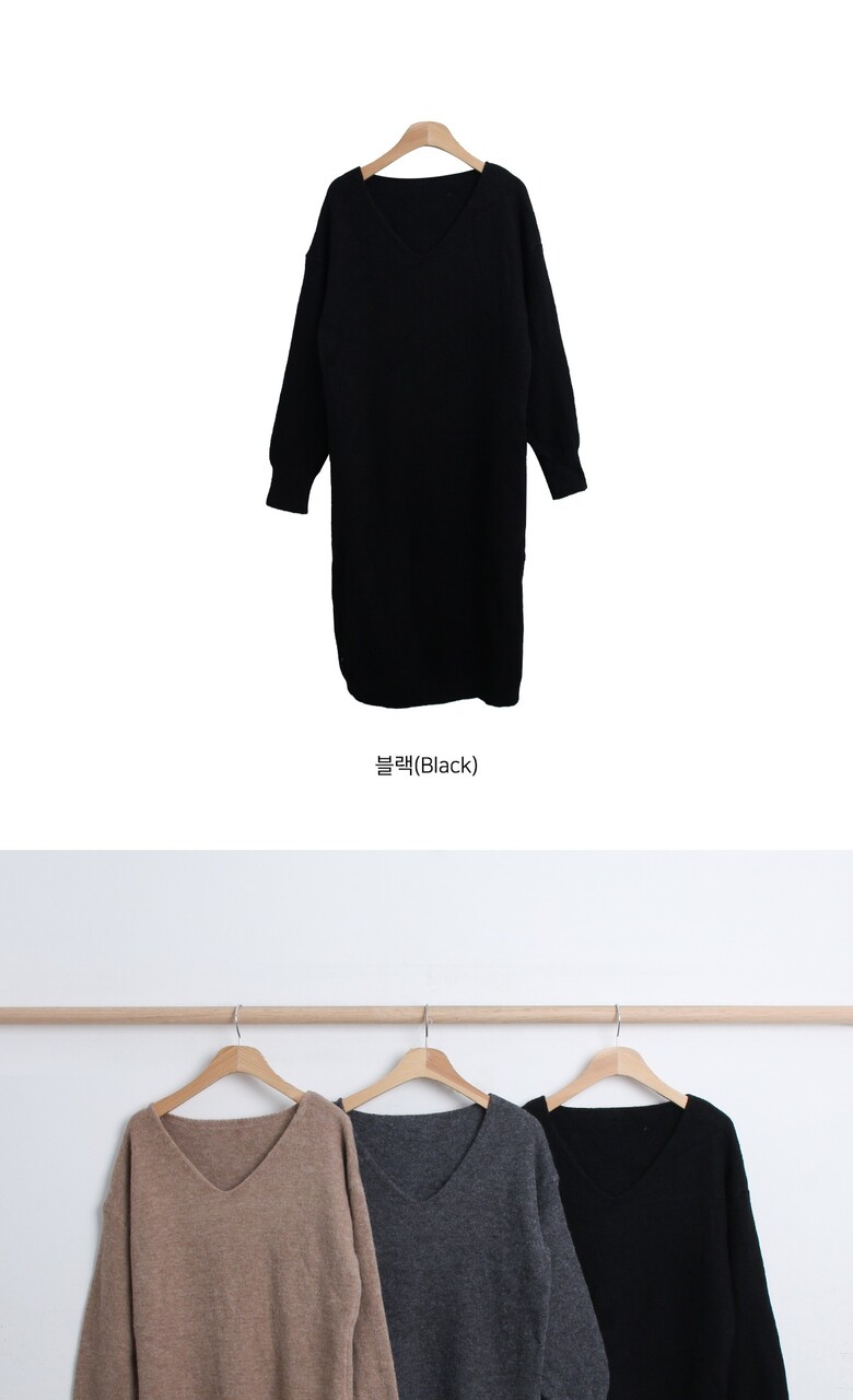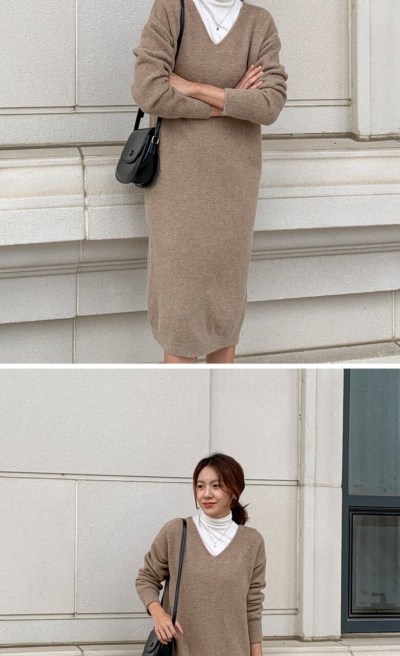 네쥬 여성 가을 브이넥 기본 무지 데일리 긴팔 롱 원피스