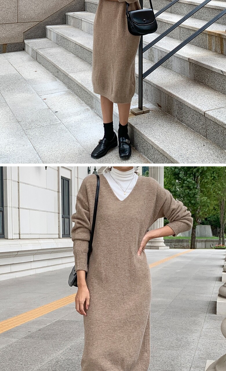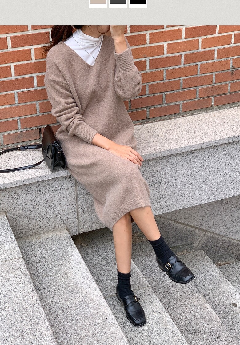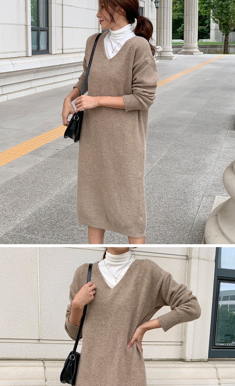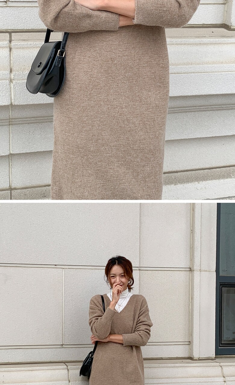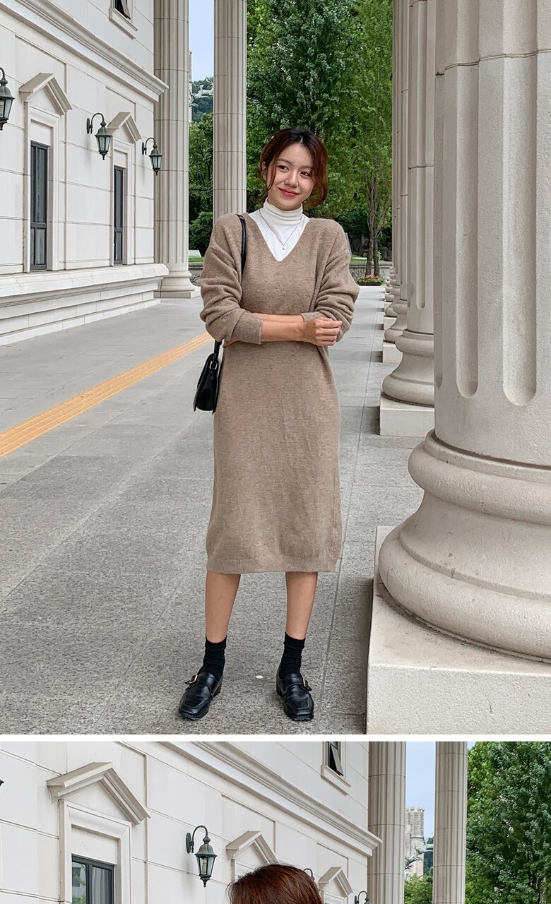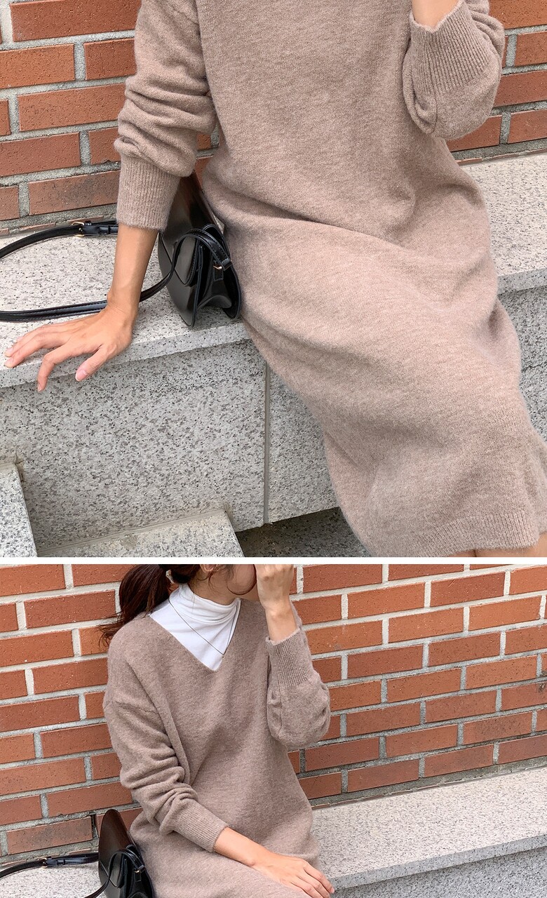 네쥬 여성 가을 브이넥 기본 무지 데일리 긴팔 롱 원피스