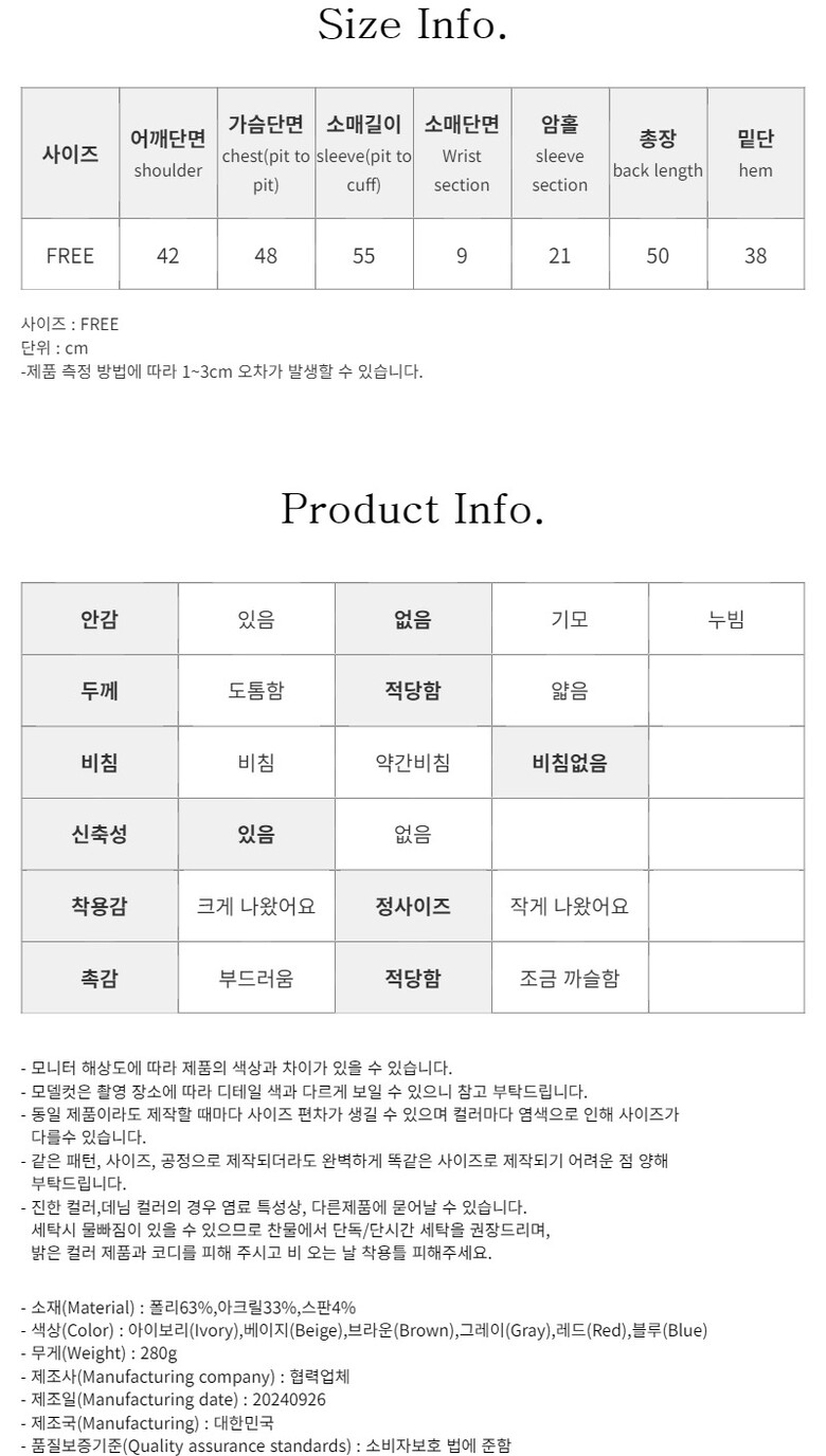 | 1. 제품 소재 (섬유의 조성 또는 혼용률을 백분율로 표시, 기능성인 경우 성적서 또는 허가서) | 상세이미지 참조 |