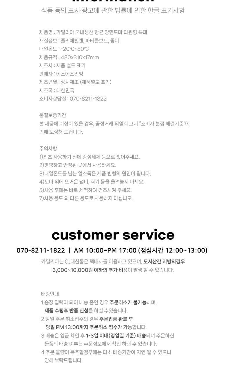 • 모든 규정은 전자상거래법에 의거하며, 택배사정으로 배송이 지연된 경우 재화를 공급받은 날로부터 7일 이내에 반품 가능합니다.
