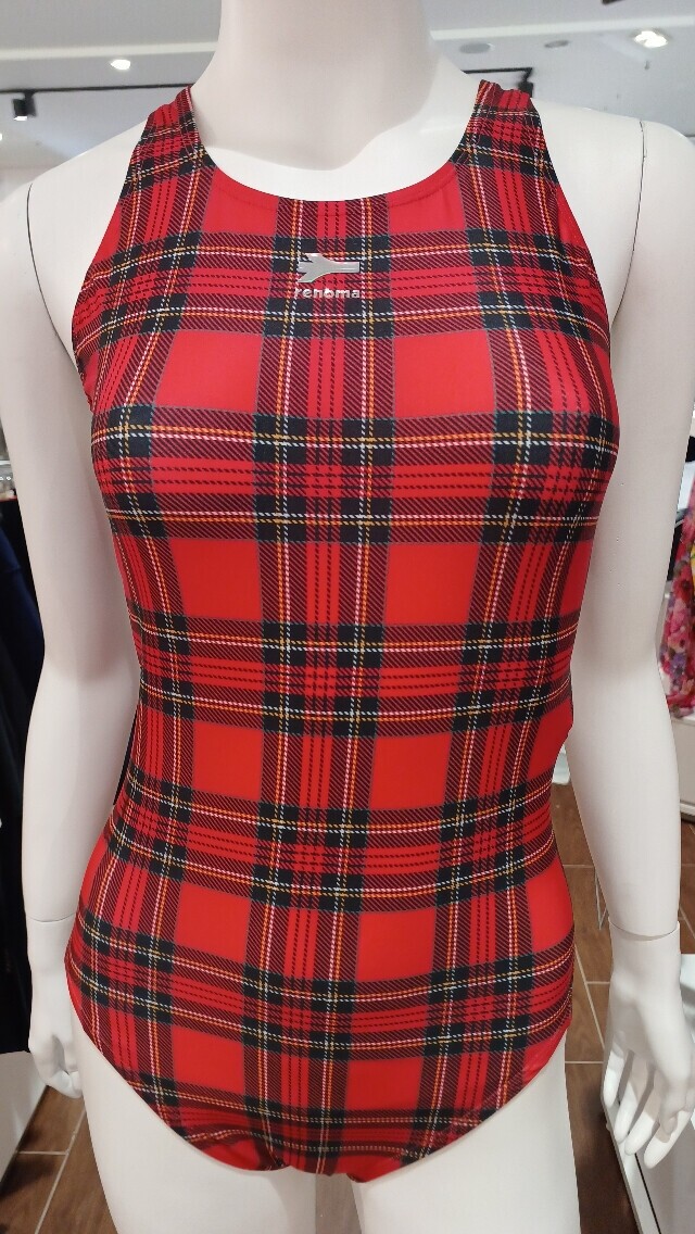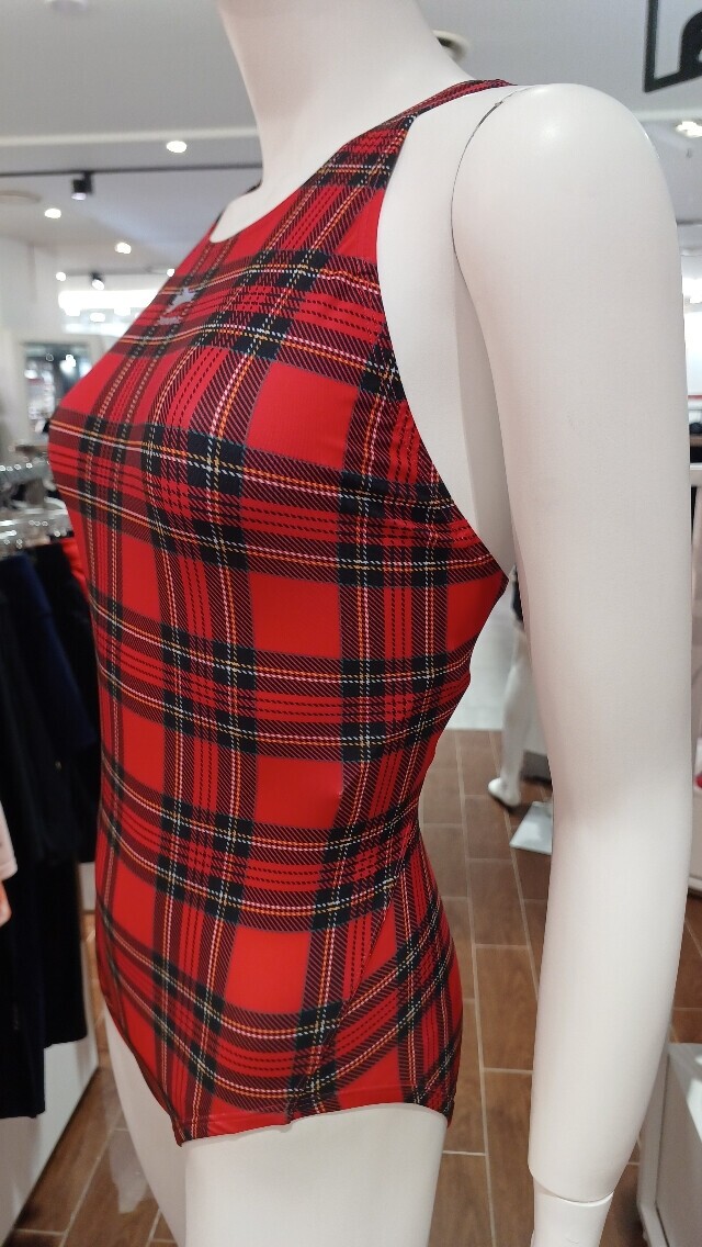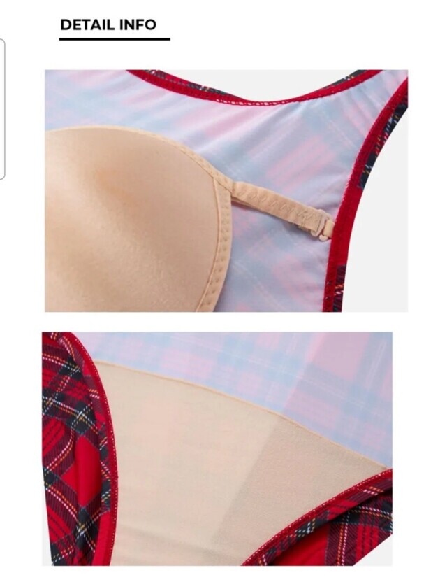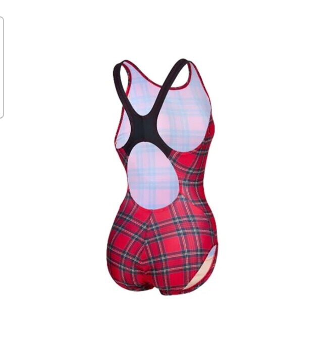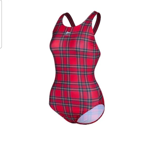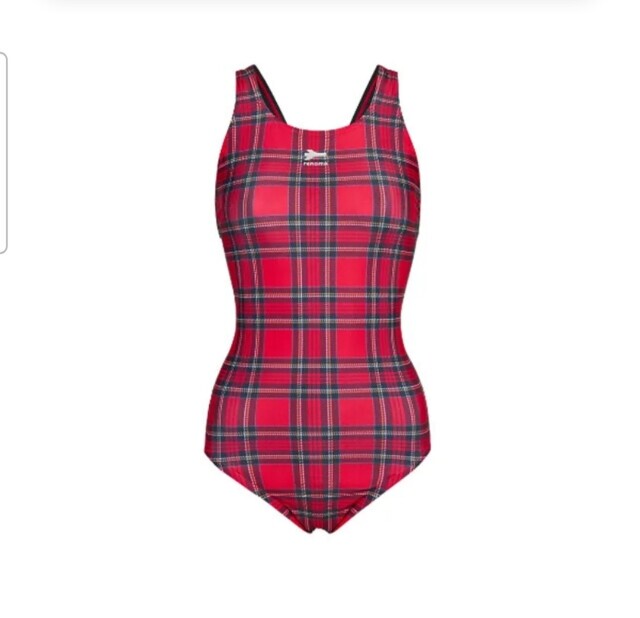 타탄 체크 프린트가 체형커버에 도움이 되며 여성 X백 원피스 수영복입니다.