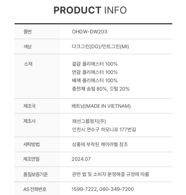 1. 제품 소재 (섬유의 조성 또는 혼용률을 백분율로 표시, 기능성인 경우 성적서 또는 허가서) 상품상세참조