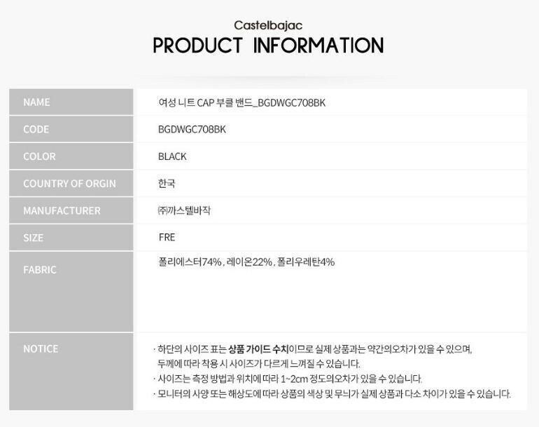 | 1. 품명 및 모델명 | 여성 부클소재 밴드 귀달이 볼캡 |
