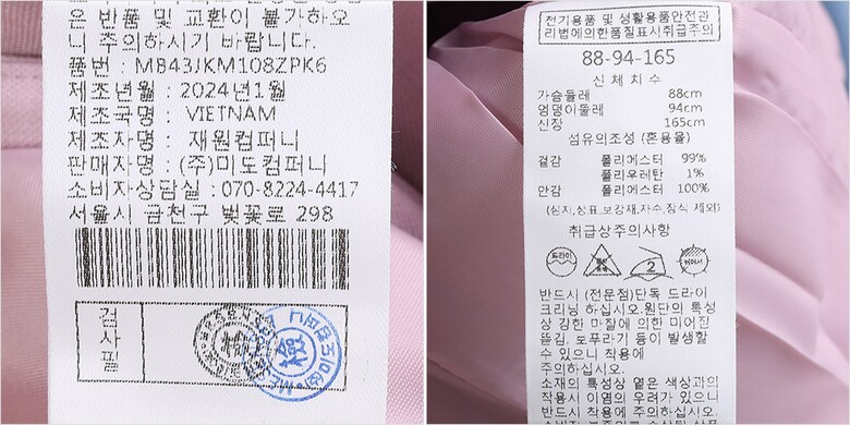 | 1. 제품 소재 (섬유의 조성 또는 혼용률을 백분율로 표시, 기능성인 경우 성적서 또는 허가서) | 겉감-폴리에스터99% 폴리우레탄1% 안감-폴리에스터100% |