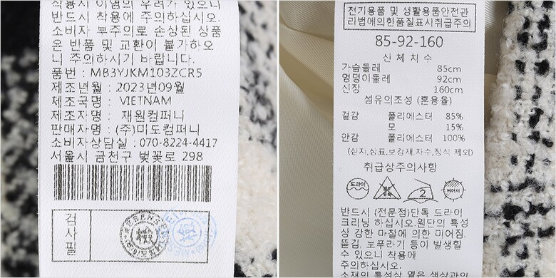 | 1. 제품 소재 (섬유의 조성 또는 혼용률을 백분율로 표시, 기능성인 경우 성적서 또는 허가서) | 겉감-폴리에스터85% 모15% 안감-폴리에스터100% |