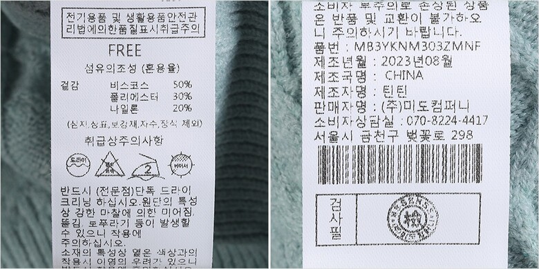 1. 제품 소재 (섬유의 조성 또는 혼용률을 백분율로 표시, 기능성인 경우 성적서 또는 허가서) | 겉감-폴리에스터30% 나일론20% 비스코스50% |