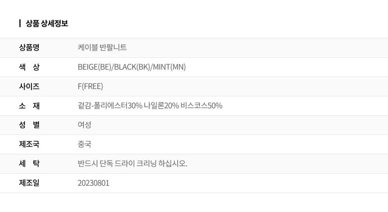 2. 색상 | 색상:BEIGE(BE)/BLACK(BK)/MINT(MN) |