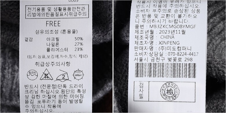 1. 제품 소재 (섬유의 조성 또는 혼용률을 백분율로 표시, 기능성인 경우 성적서 또는 허가서) 겉감-폴리에스터23% 나일론27% 아크릴50%
