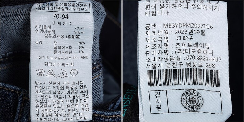 | 1. 제품 소재 (섬유의 조성 또는 혼용률을 백분율로 표시, 기능성인 경우 성적서 또는 허가서) | 겉감-면94% 폴리에스터5% 폴리우레탄1% |