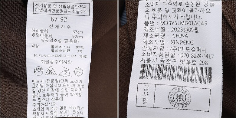 | 1. 제품 소재 (섬유의 조성 또는 혼용률을 백분율로 표시, 기능성인 경우 성적서 또는 허가서) | 겉감-폴리에스터97% 폴리우레탄3% |