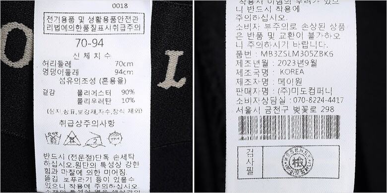1. 제품 소재 (섬유의 조성 또는 혼용률을 백분율로 표시, 기능성인 경우 성적서 또는 허가서) | 겉감-폴리에스터90% 폴리우레탄10% |