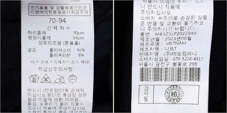 1. 제품 소재 (섬유의 조성 또는 혼용률을 백분율로 표시, 기능성인 경우 성적서 또는 허가서) 겉감-폴리에스터92% 폴리우레탄8%