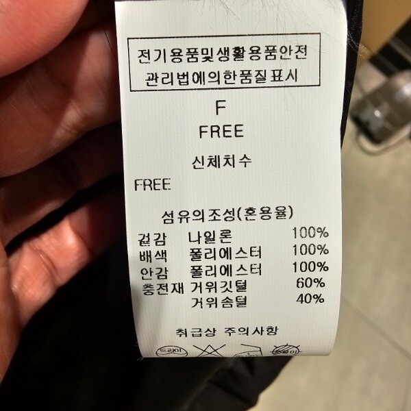 제품소재 : 충전재 구스 깃털 60% 구스 솜털 40% 겉감 나일론 100% 안감 배색 폴리에스터 100%