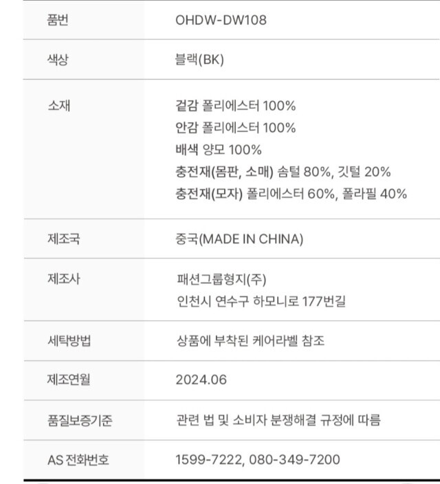 | 6. 세탁방법 및 취급시 주의사항 | 상품상세참조 |