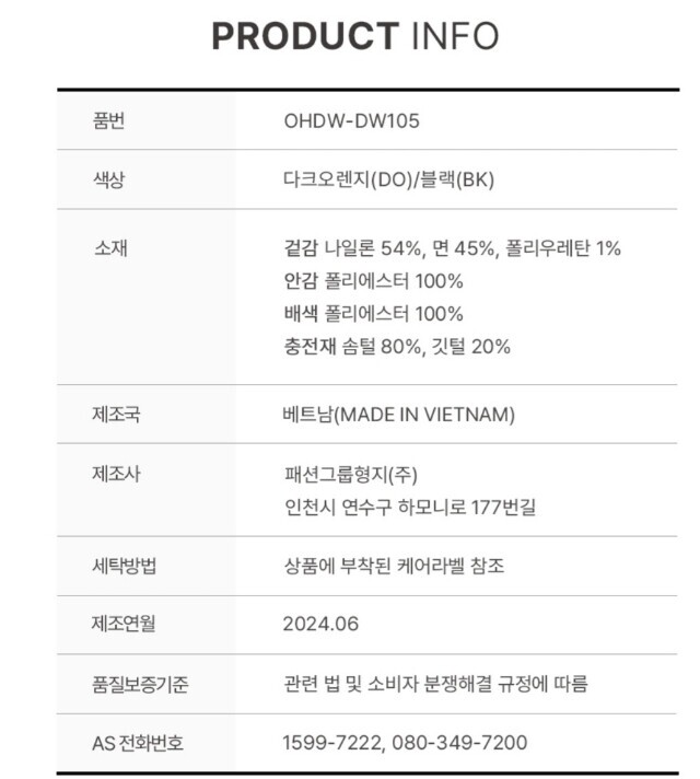 오리비아하스러 하이넥 덕다운OHDWDW105