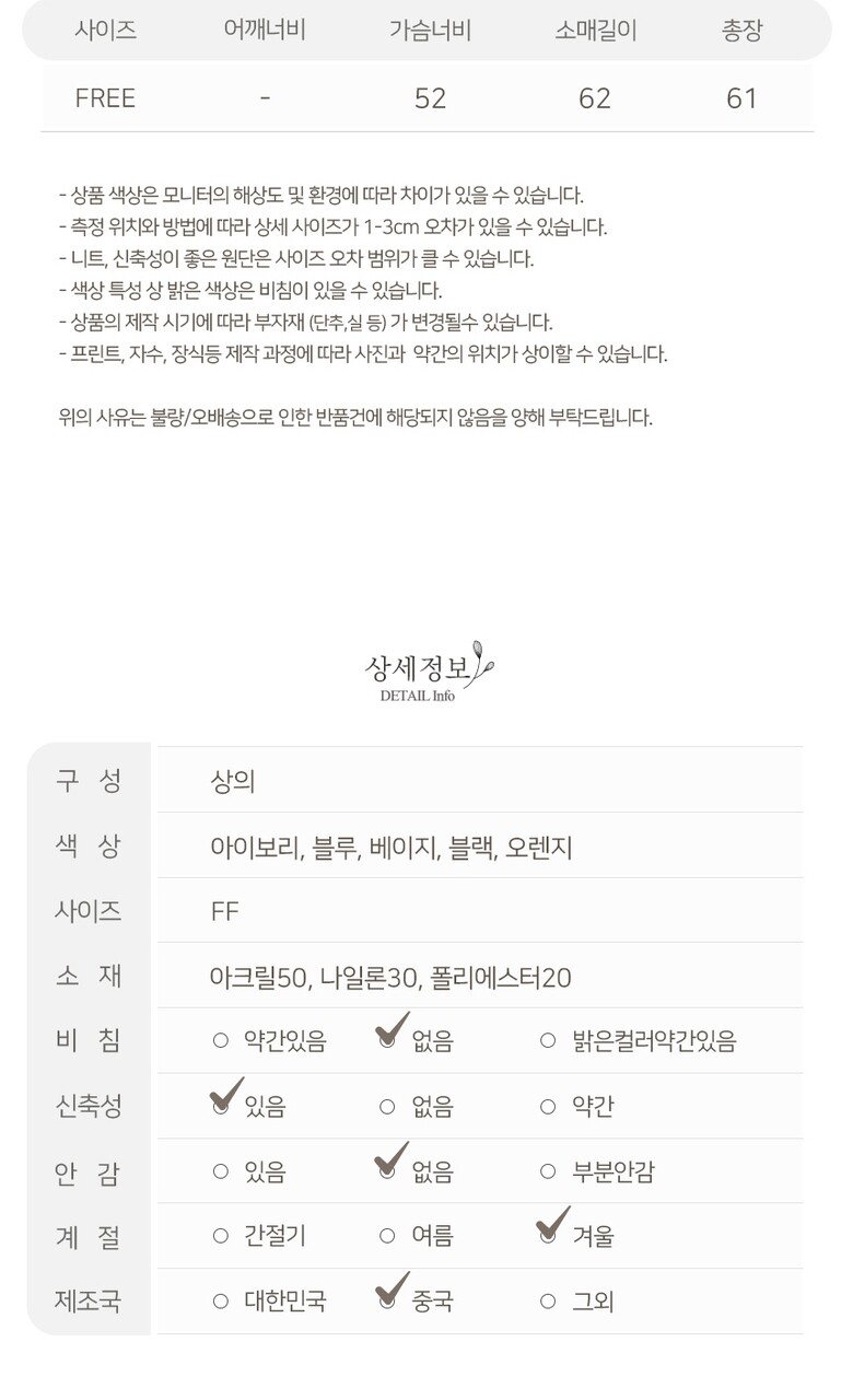 • 처음 배송된 상품상태와 다를 경우(세탁/착용 후 외출하신 경우) 반품이 불가합니다.