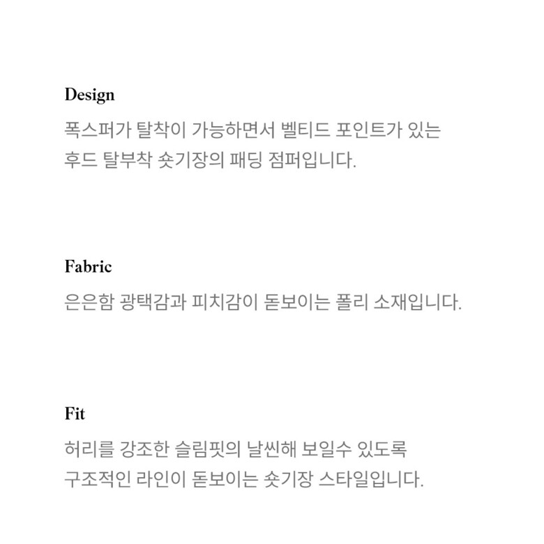 | 1. 제품 소재 (섬유의 조성 또는 혼용률을 백분율로 표시, 기능성인 경우 성적서 또는 허가서) | 상품상세참조 |