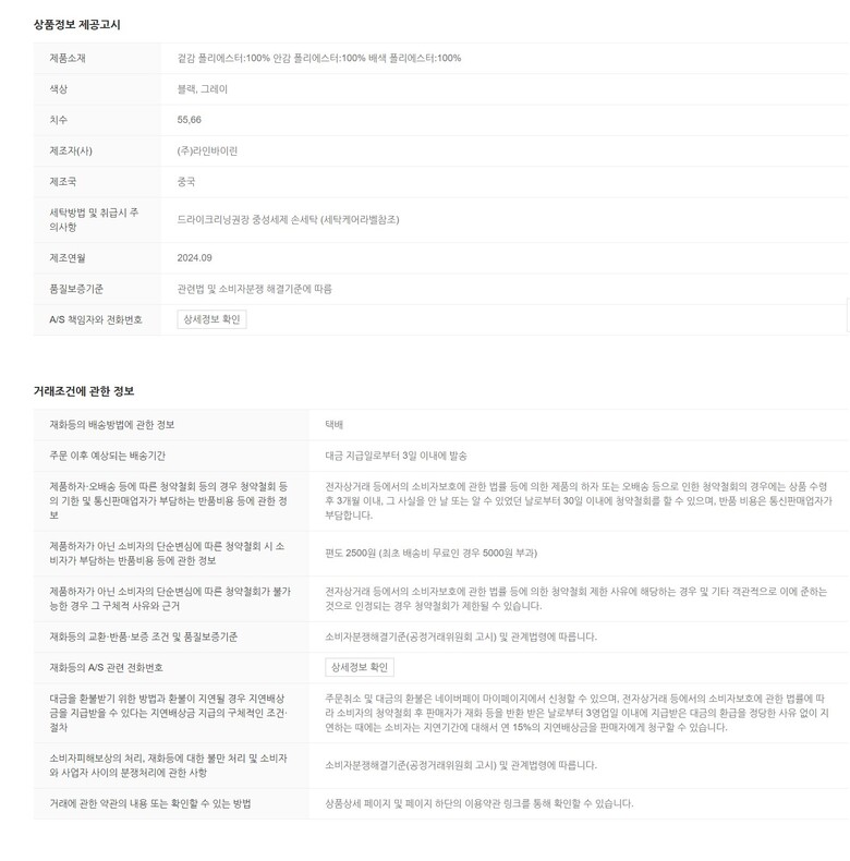 1. 제품 소재 (섬유의 조성 또는 혼용률을 백분율로 표시, 기능성인 경우 성적서 또는 허가서) | 상품상세참조 |