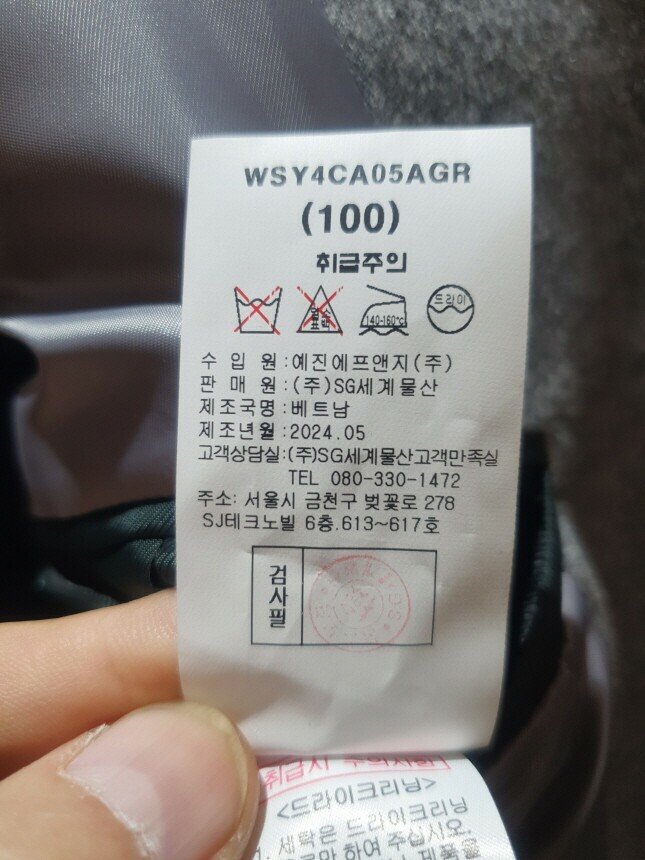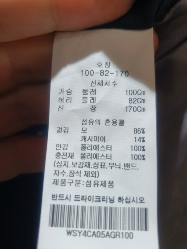 | 1. 제품 소재 (섬유의 조성 또는 혼용률을 백분율로 표시, 기능성인 경우 성적서 또는 허가서) | 겉감 : 모 86% , 캐시미어 14% 안감 : 폴리에스터 100% 충전재 : 폴 |
