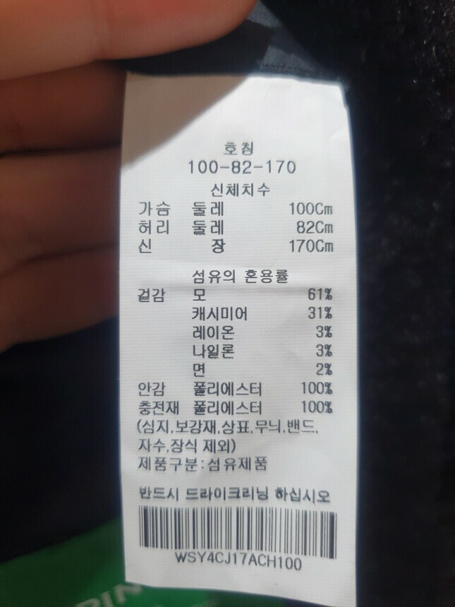 겉감 : 모 61% , 캐시미어 31% , 레이온 3% , 나일론 3%, 면 2%