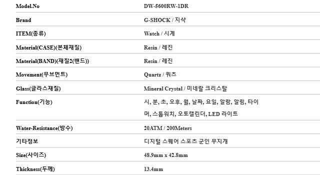 | 7. 주요 사양 | 레진 시계 쿼츠 |