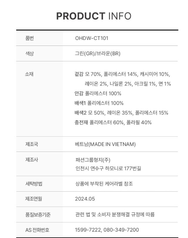 1. 제품 소재 (섬유의 조성 또는 혼용률을 백분율로 표시, 기능성인 경우 성적서 또는 허가서) 상품상세참조