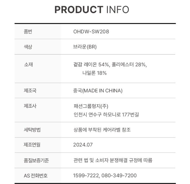• 처음 배송된 상품상태와 다를 경우(세탁/착용 후 외출하신 경우) 반품이 불가합니다.