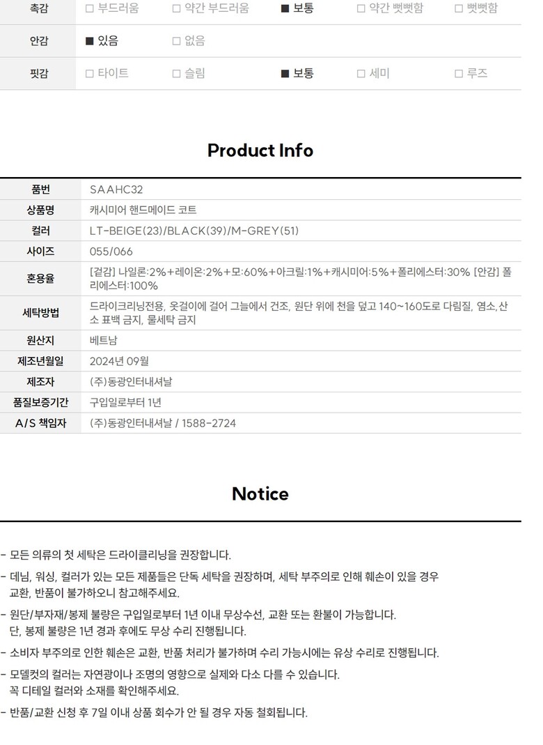| 6. 세탁방법 및 취급시 주의사항 | 상품상세참조 |