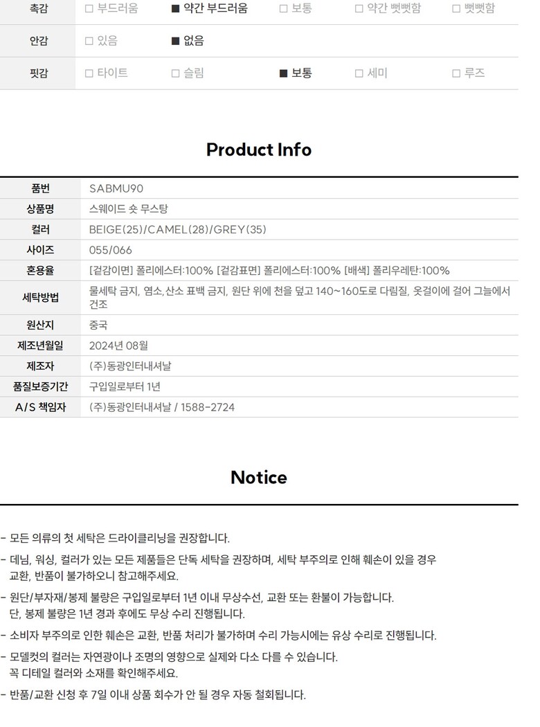 1. 제품 소재 (섬유의 조성 또는 혼용률을 백분율로 표시, 기능성인 경우 성적서 또는 허가서) 상품상세참조
