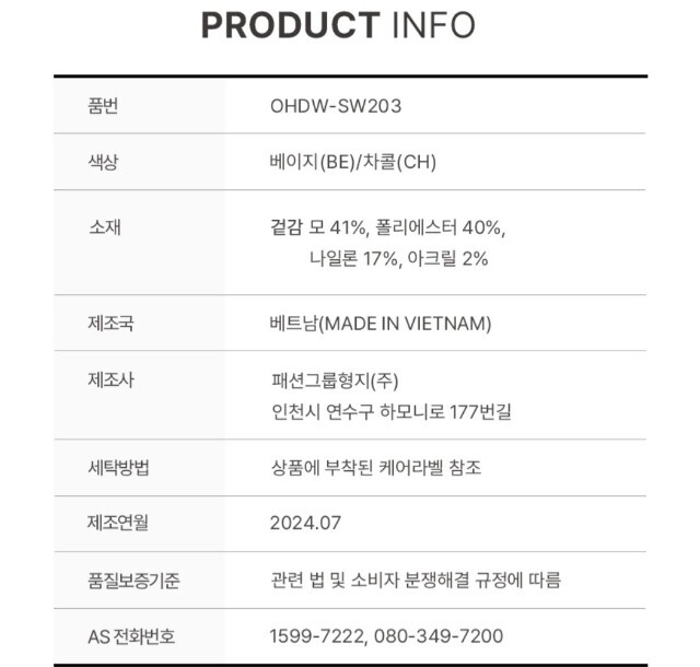 1. 제품 소재 (섬유의 조성 또는 혼용률을 백분율로 표시, 기능성인 경우 성적서 또는 허가서) | 상품상세참조 |