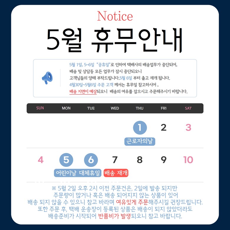 • 모든 규정은 전자상거래법에 의거하며, 택배사정으로 배송이 지연된 경우 재화를 공급받은 날로부터 7일 이내에 반품 가능합니다.