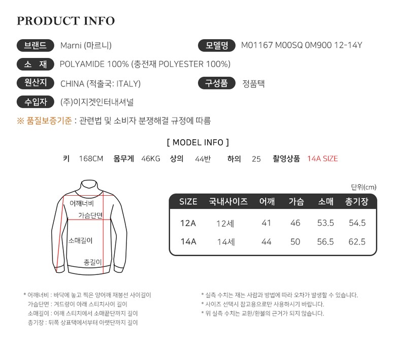 [명품] 마르니 여성 스타 퀄팅 다운 자켓 블랙 성인 M01167 M00SQ 0M900 12 14Y