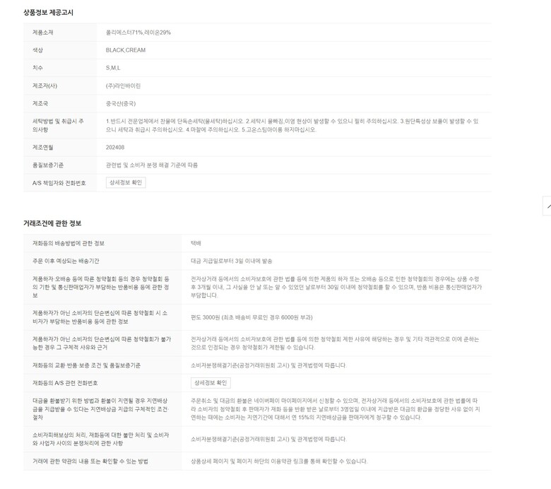 | 6. 세탁방법 및 취급시 주의사항 | 상품상세참조 |