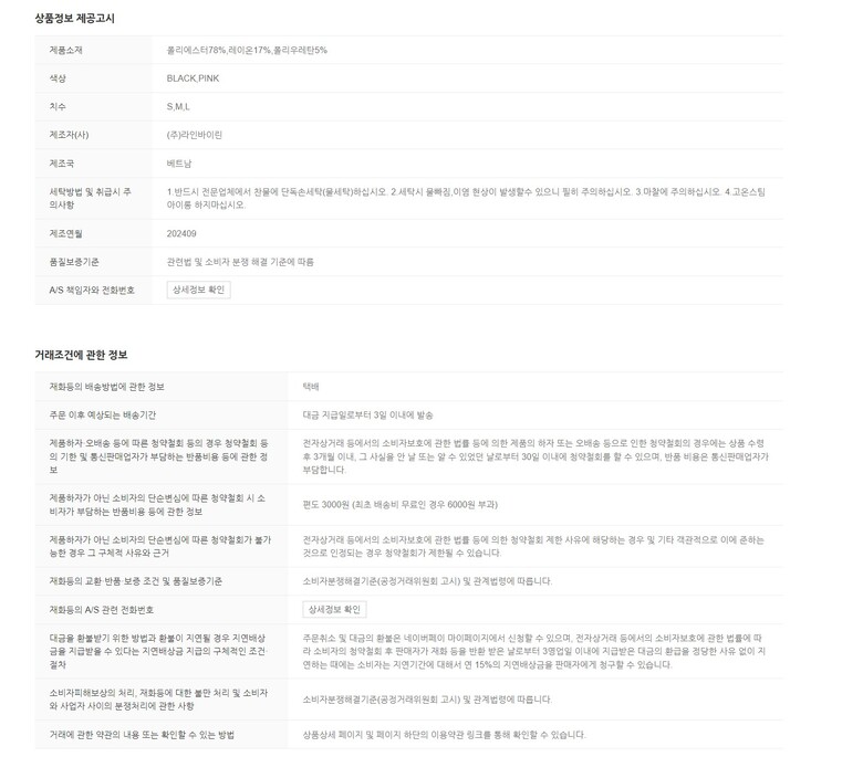 1. 제품 소재 (섬유의 조성 또는 혼용률을 백분율로 표시, 기능성인 경우 성적서 또는 허가서) 상품상세참조