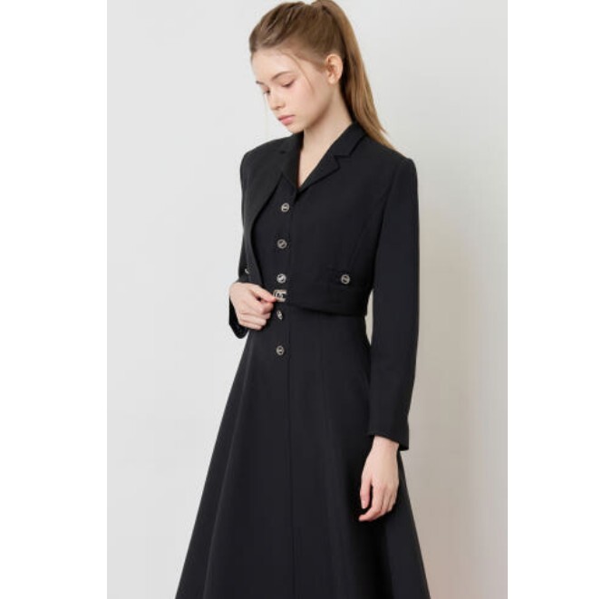 셔츠 원피스와 자켓을 함께 착용한 듯한 디자인이 매력적이며|*|