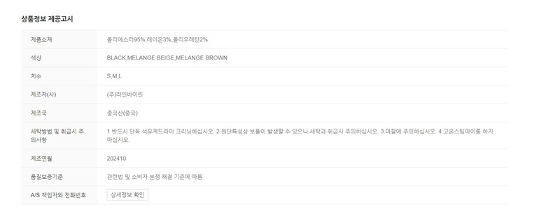 | 6. 세탁방법 및 취급시 주의사항 | 상품상세참조 |