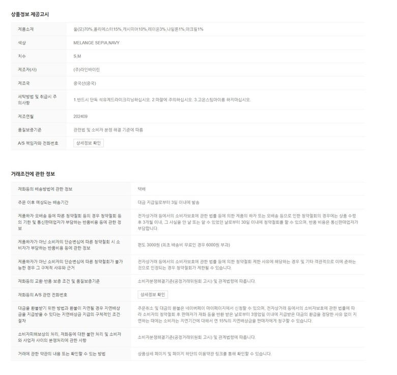 1. 제품 소재 (섬유의 조성 또는 혼용률을 백분율로 표시, 기능성인 경우 성적서 또는 허가서) 상품상세참조