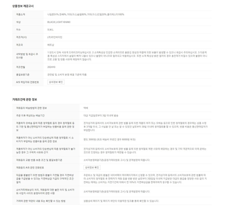 1. 제품 소재 (섬유의 조성 또는 혼용률을 백분율로 표시, 기능성인 경우 성적서 또는 허가서) | 상품상세참조 |