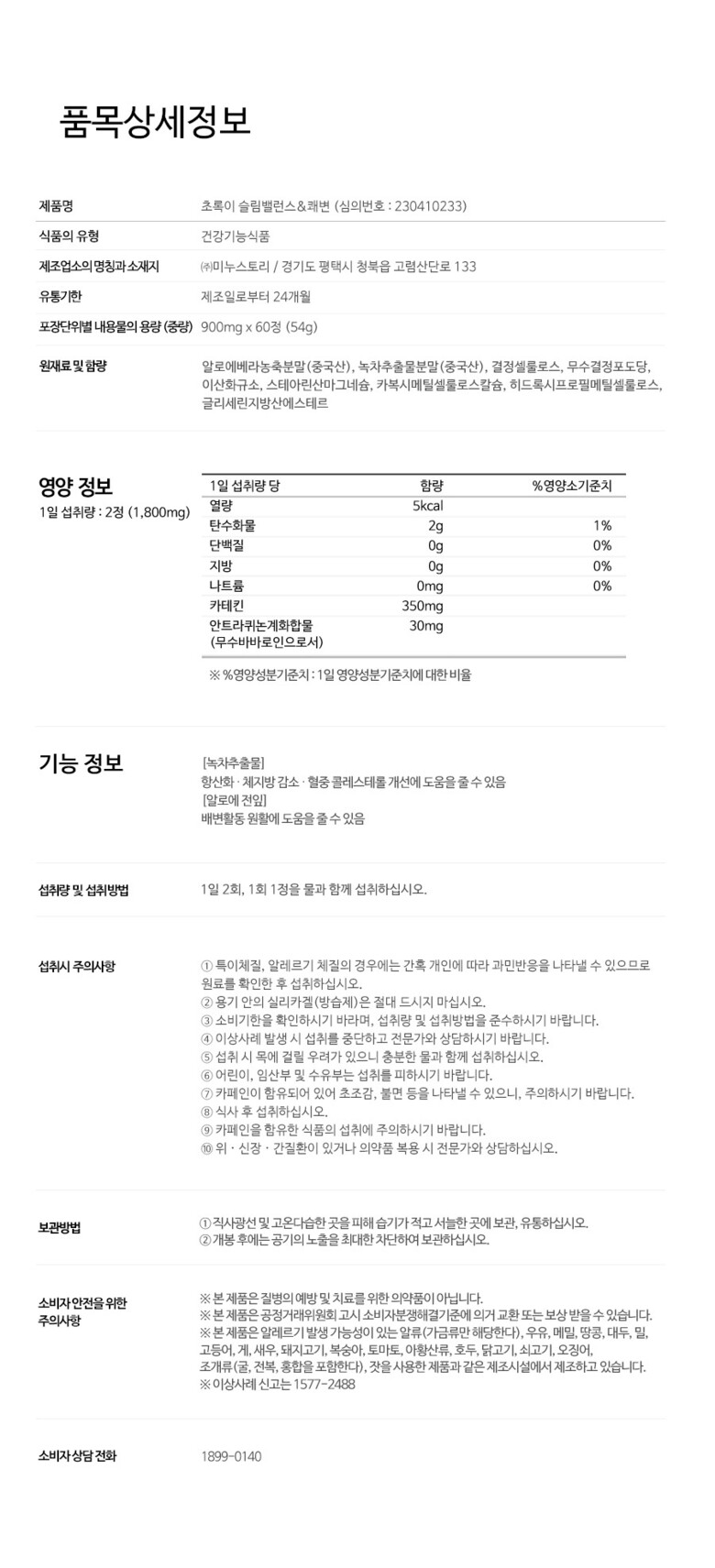 | 6. 원재료명 및 함량 | 가르시니아캄보지아 추출물(인도산), 비오틴(프랑스산), 판토텐산칼슘(영국산), 비타민B6염산염, 비타민B1염산염, 비타민B2, 말토덱스트린, 결정셀룰로스, 카복시메틸셀룰로스칼슘, 스테아린산마그네슘, 이산화규소, 히드록시프로필셀룰로스, 히드록시프로필메틸셀룰로스, 글리세린지방산에스테르 알로에베라농축분말(중국산), 녹차추출물분말(중국산), 결정셀룰로스, 무수결정포도당, 이산화규소, 스테아린산마그네슘, 카복시메틸셀룰로스칼슘, 히드록시프로필메틸셀룰로스, 글리세린지방산에스테르 |