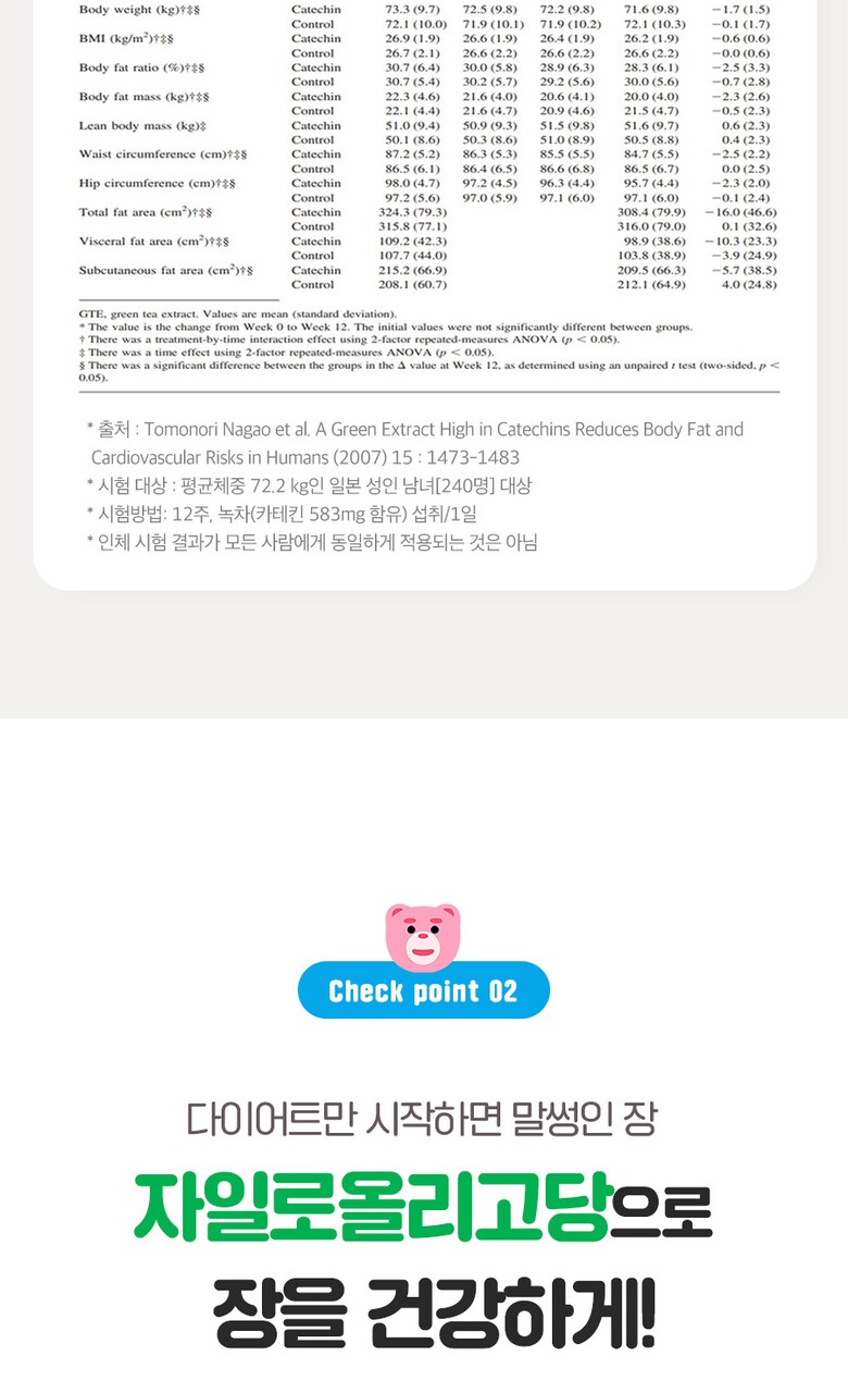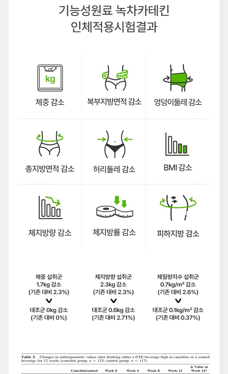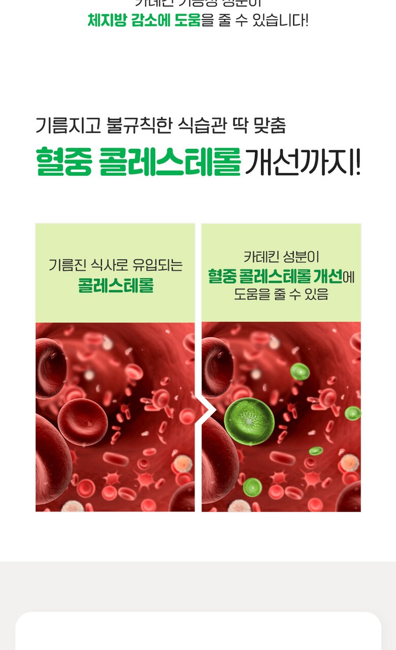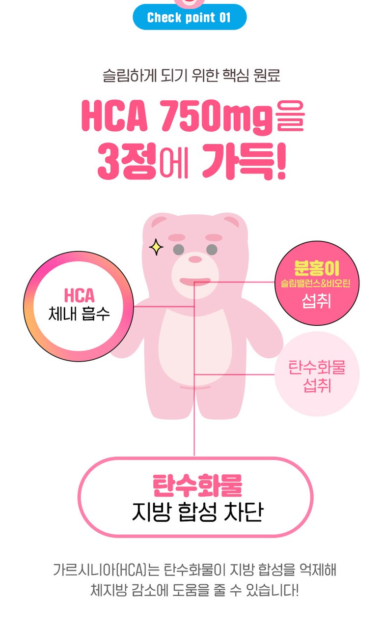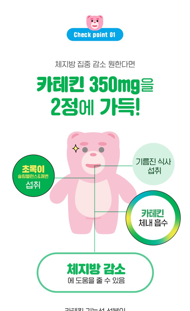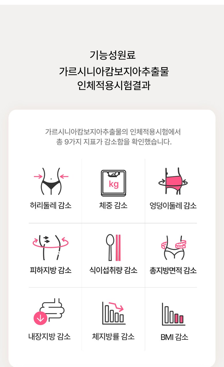 | 8. 기능정보 | [가르시니아캄보지아 추출물] 탄수화물이 지방으로 합성되는 것을 억제하여 체지방 감소에 도움을 줄 수 있음 [비오틴] 지방,탄수화물, 단백질 대사와 에너지 생성에 필요 [비타민B1] 탄수화물과 에너지 대사에 필요 [비타민B2] 체내 에너지 생성에 필요 [비타민B6] 단백질 및 아미노산 이용에 필요, 혈액의 호모시스테인 수준을 정상으로 유지하는데 필요 [판토텐산] 지방, 탄수화물, 단백질 대사와 에너지 생성에 필요 [녹차추출물] 항산화·체지방 감소·혈중 콜레스테롤 개선에 도움을 줄 수 있음 [알로에전잎] 배변활동 원활에 도움을 줄 수 있음 " |