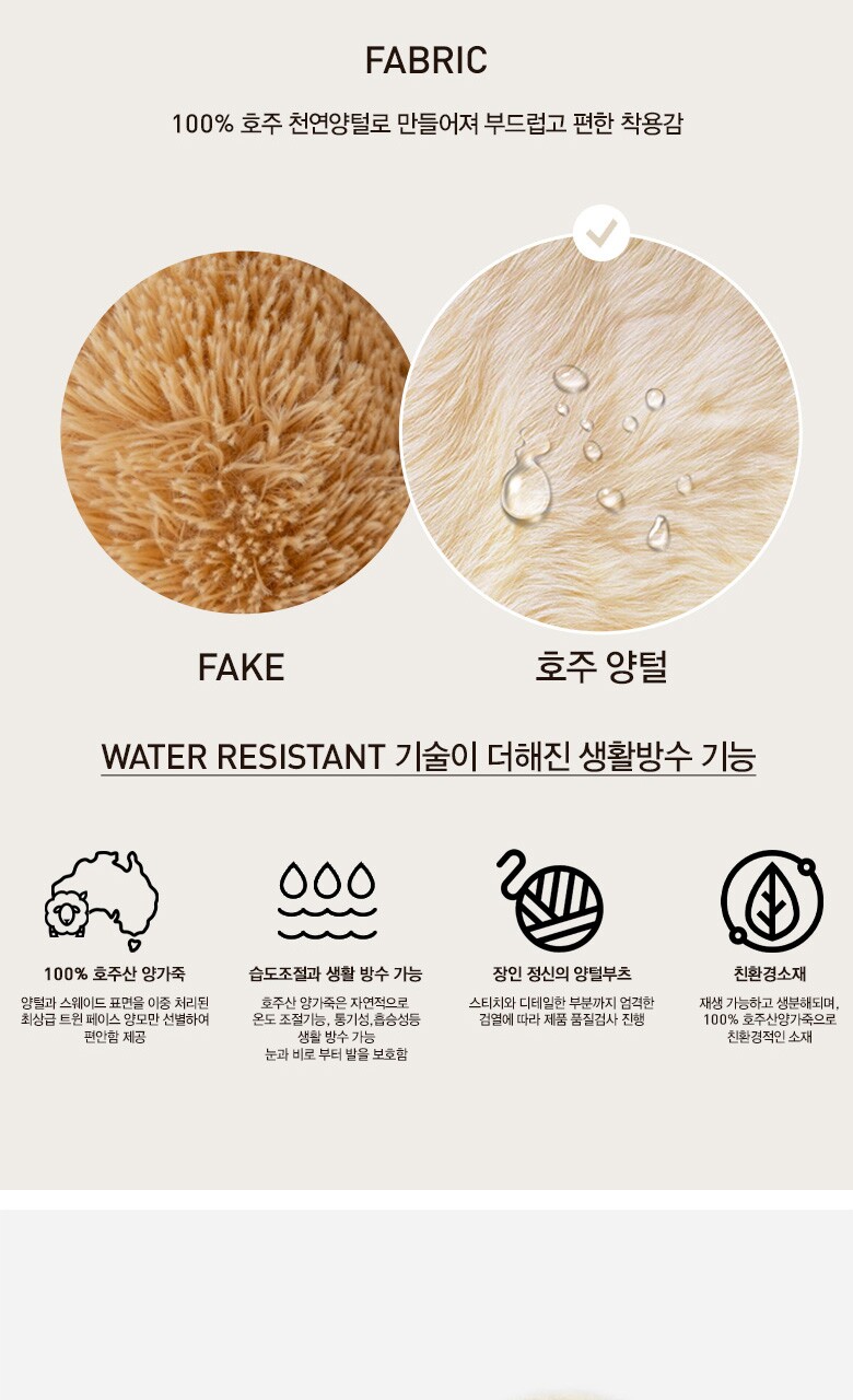 1. 제품 소재 (운동화인 경우에는 겉감, 안감을 구분하여 표시) 겉감 : DOUBLE FACE SHEEPSHKIN / 내피 : SHEEPSHKIN / 창 :EVA