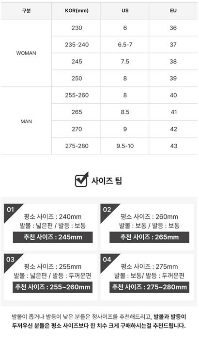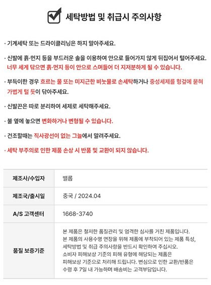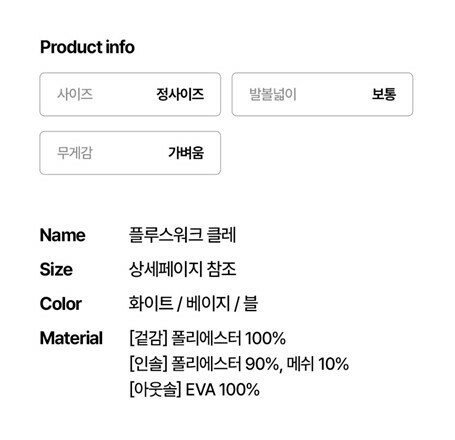 | 1. 제품 소재 (운동화인 경우에는 겉감, 안감을 구분하여 표시) | 상품상세참조 |