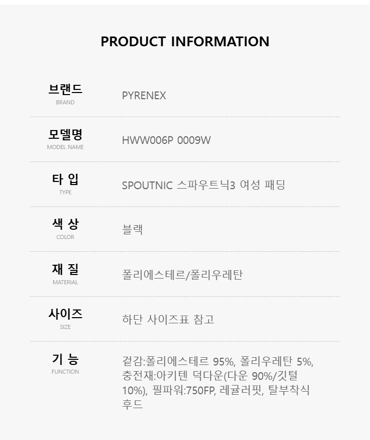 피레넥스 HWW006P 0009W SPOUTNIC 스파우트닉3 덕다운 여성 패딩 점퍼